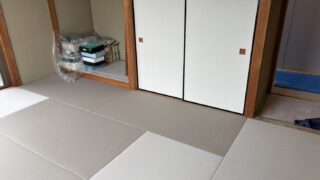 琉球畳 施工例 館林市で琉球畳にリフォーム 1畳(長方形)サイズ 消臭・防炎の樹脂畳 館林市で畳替えと襖張替えを施工しました。縁付き畳から琉球畳へ変更し、畳表は消臭・防炎機能付き「極美爽(ミンクグレー)」を使用。落ち着きと温かみのある色合いです。 2025.10.22 琉球畳 施工例