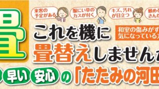 リフォーム 熊谷市の畳替え事例 熊谷市の皆さま、畳替えはいかがですか。創業100年の畳店 河田製畳 熊谷市で畳替え・和室リフォームなら創業100年以上の河田製畳へ。畳表替え、新畳、琉球畳、ふすま・障子の張替えまで対応。見積もり・ご相談は無料です。 2025.09.29 リフォーム