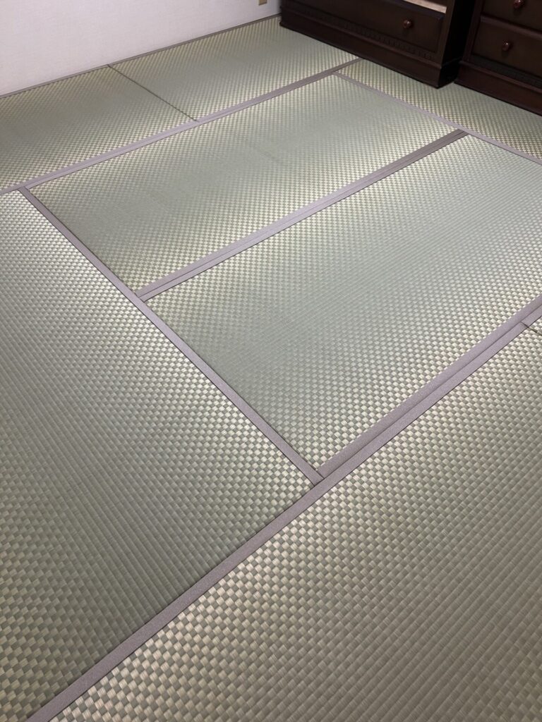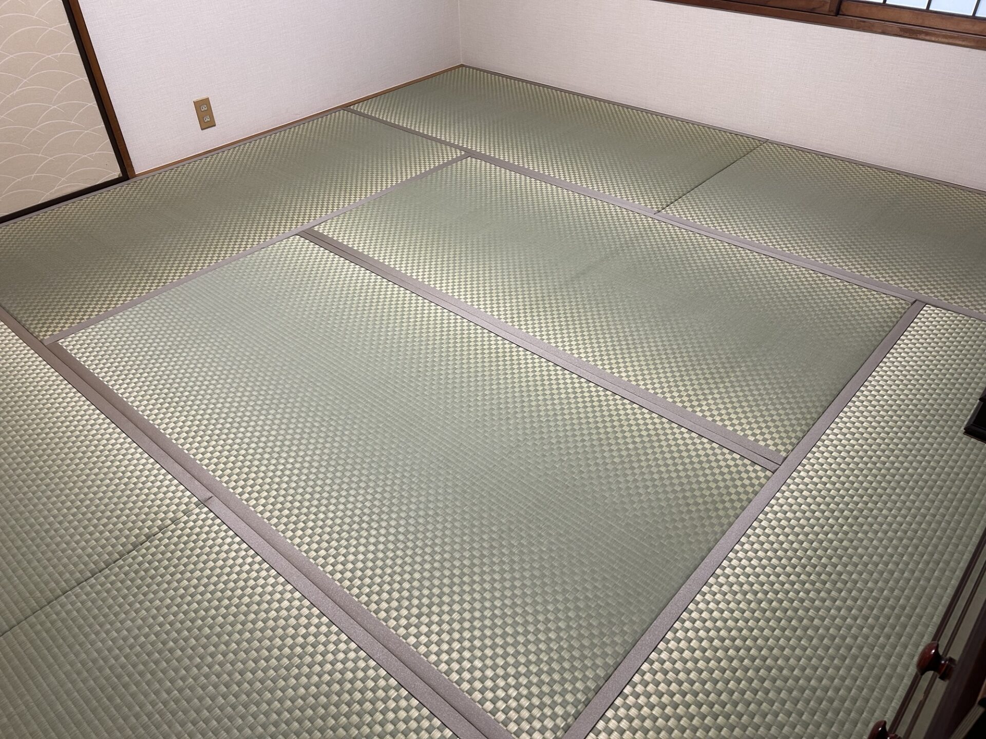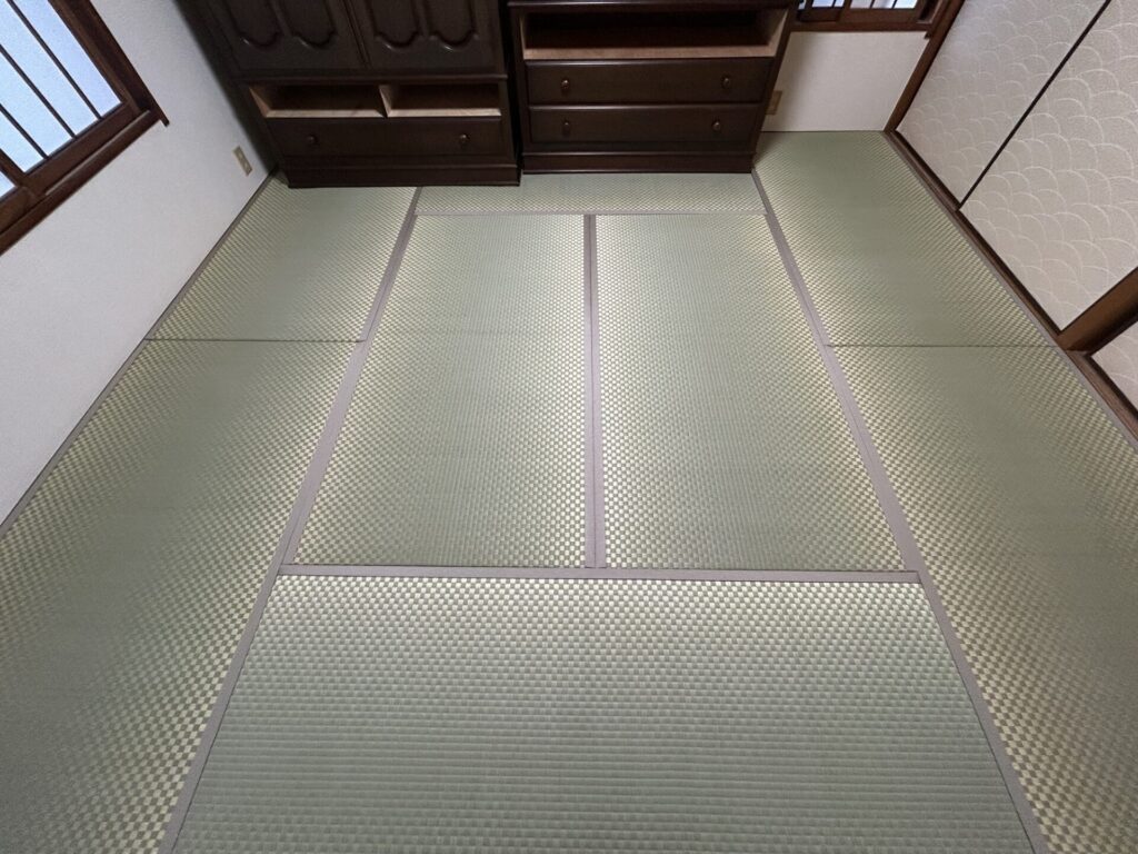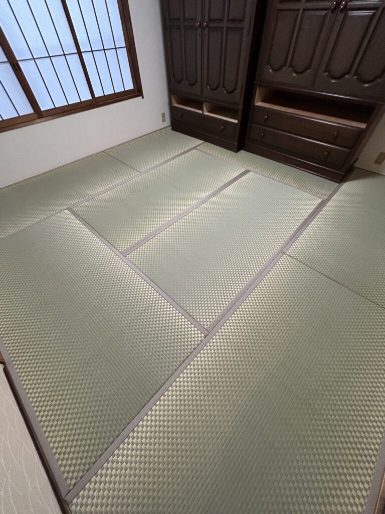 お見積りにお伺いした際に、畳表の見本帳をご覧いただき、熊本県産の市松柄の天然い草畳表を気に入っていただきました。「せっかく張り替えるなら、きれいな柄の畳を試してみたい」と、初めて市松柄をご覧になったお客様。少し不安もあったそうですが、最終的には「想像以上にきれいで嬉しい」と大変ご満足いただけました。