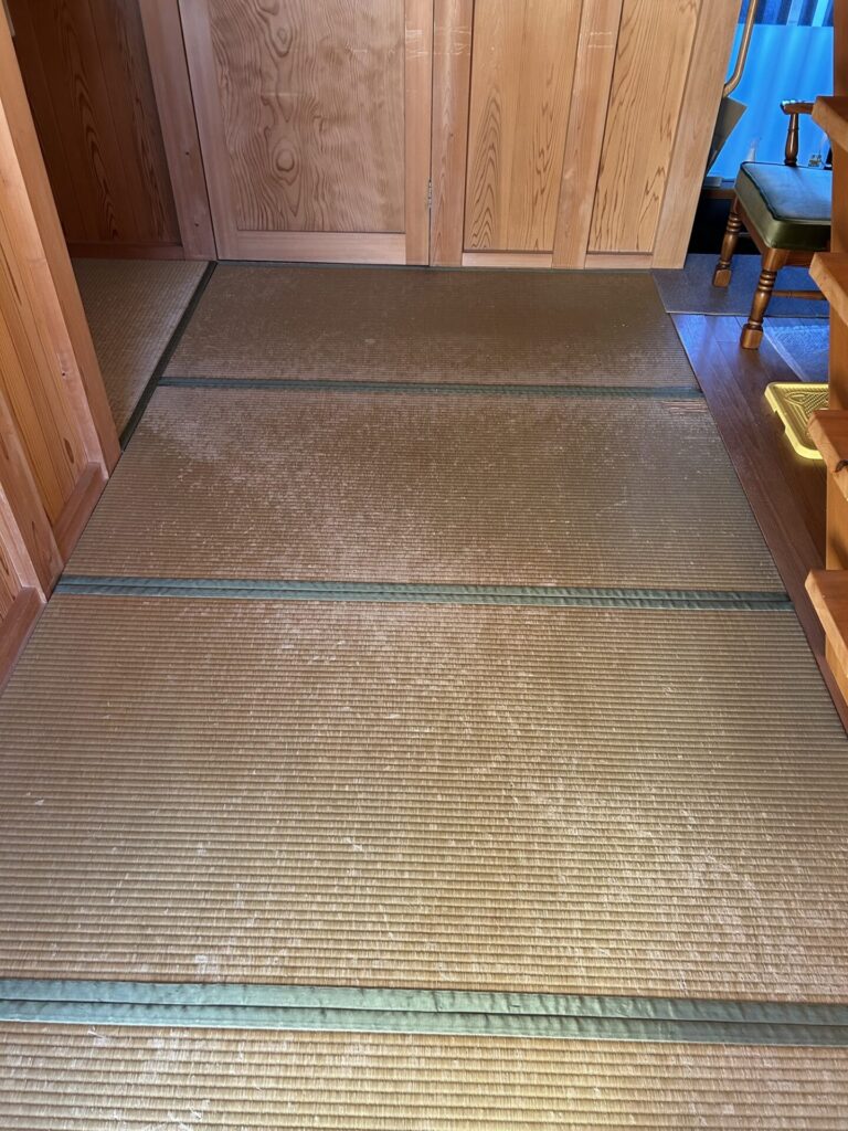 和室・廊下ともに、長年のご使用により畳表だけでなく、畳床(畳の芯材)まで傷みが見られたため、今回は畳床から新しくする「新畳入れ替え工事」となりました。